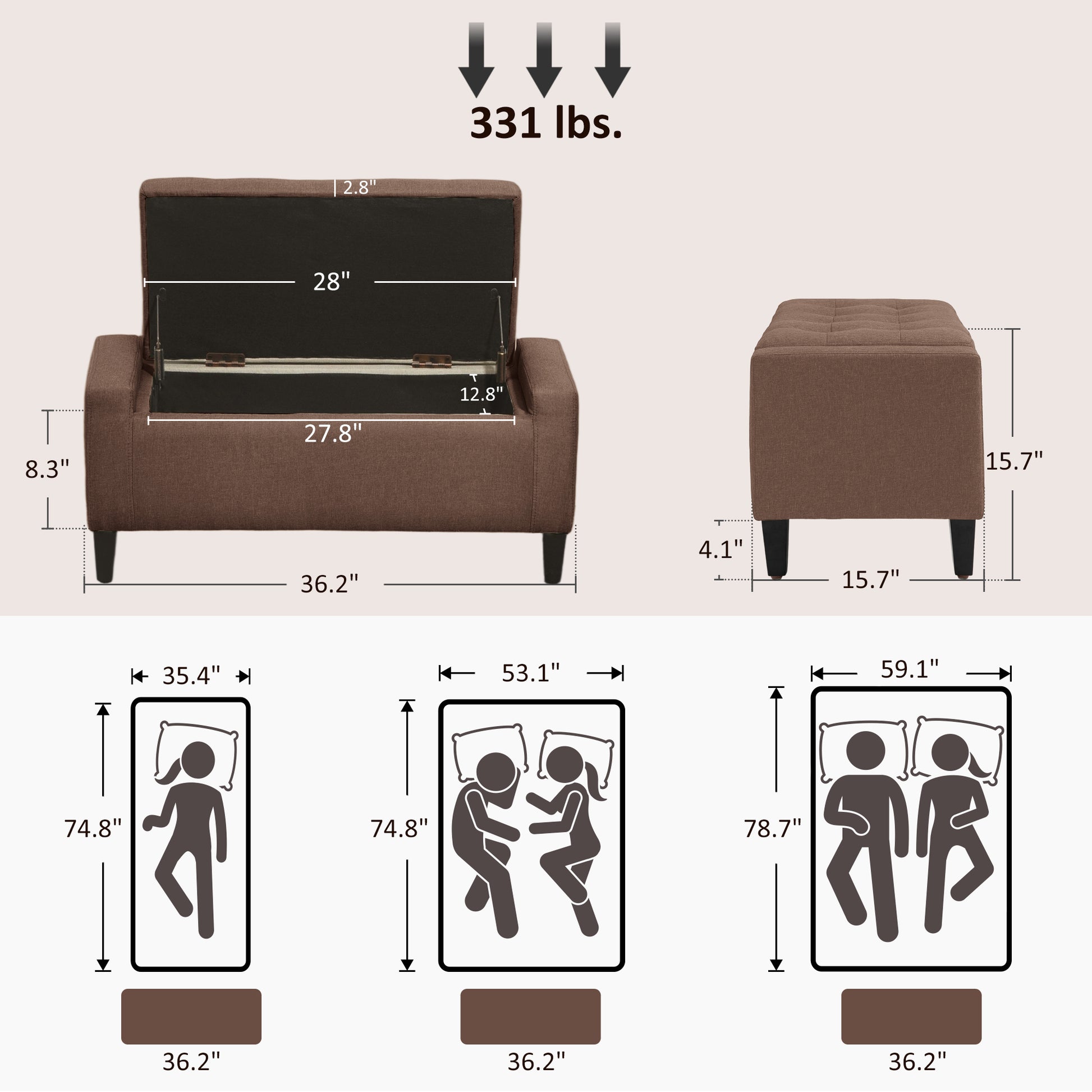 Organize your living room with this ottoman with storage for living room from HOMCOM. Classic appearance and matchable color make it perfect for any room in your house. Ample storage space helps you better organize your home and can be a footrest, bed stool, and even a coffee table. Premium materials are employed for ensuring long-lasting use. Features: - Classic appearance storage ottoman could match with most styles of house - High-density foam and linen-feel fabric cover gives it extra soft and comfortable for sitting - Flipping lid design makes it easy to open and put clutters into it - It's a great decor and organizer with ample storage space for your belongings and clutters - The rubberwood feet ensure its durability - Easy assembly required Specification: - Color: Dark Brown - Material: Linen (100% Polyester), Foam, Rubberwood, Poplar - Overall Dimension: 36.25" W x 15.75" D x 15.75" H - Inner Storage Size: 27.75" W x 12.75" D x 8.25" H - Weight Capacity: 330lbs - Item Label: 838-022V80BN Package Includes: - 1 x Storage Ottoman - 1 x Manual Organize your living room with this ottoman with storage for living room from HOMCOM. Features: - Classic appearance storage ottoman could match with most styles of house - High-density foam and linen-feel fabric cover gives it extra soft and comfortable for sitting - Flipping lid design makes it easy to open and put clutters into it - It's a great decor and organizer with ample storage space for your belongings and clutters - The rubberwood feet ensure its durability - Easy assembly required Specification: - Color: Beige - Material: Linen (100% Polyester), Foam, Rubberwood, Poplar - Overall Dimension: 36.25" W x 15.75" D x 15.75" H - Inner Storage Size: 27.75" W x 12.75" D x 8.25" H - Weight Capacity: 330lbs - Item Label: 838-022V80CW Package Includes: - 1 x Storage Ottoman - 1 x Manual Organize your living room with this ottoman with storage for living room from HOMCOM. Features: - Classic appearance storage ottoman could match with most styles of house - High-density foam and linen-feel fabric cover gives it extra soft and comfortable for sitting - Flipping lid design makes it easy to open and put clutters into it - It's a great decor and organizer with ample storage space for your belongings and clutters - The rubberwood feet ensure its durability - Easy assembly required Specification: - Color: Gray - Material: Linen (100% Polyester), Foam, Rubberwood, Poplar - Overall Dimension: 36.25" W x 15.75" D x 15.75" H - Inner Storage Size: 27.75" W x 12.75" D x 8.25" H - Weight Capacity: 330lbs - Item Label: 838-022V80GY Package Includes: - 1 x Storage Ottoman - 1 x Manual Organize your living room with this ottoman with storage for living room from HOMCOM. Features: - Classic appearance storage ottoman could match with most styles of house - High-density foam and linen-feel fabric cover gives it extra soft and comfortable for sitting - Flipping lid design makes it easy to open and put clutters into it - It's a great decor and organizer with ample storage space for your belongings and clutters - The rubberwood feet ensure its durability - Easy assembly required Specification: - Color: Dark Blue - Material: Linen (100% Polyester), Foam, Rubberwood, Poplar - Overall Dimension: 36.25" W x 15.75" D x 15.75" H - Inner Storage Size: 27.75" W x 12.75" D x 8.25" H - Weight Capacity: 330lbs - Item Label: 838-022V80DB Package Includes: - 1 x Storage Ottoman - 1 x Manual.