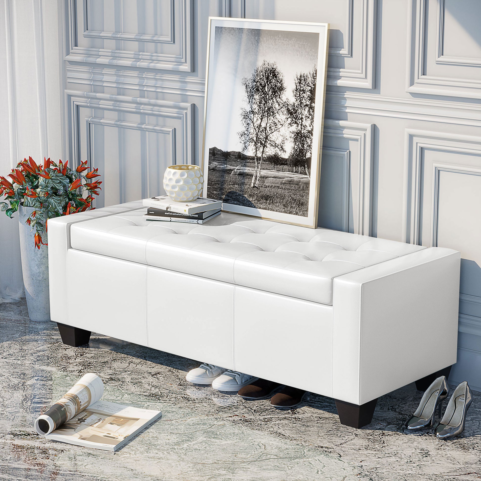 50.5" Faux Leather Rectangular Tufted Storage Ottoman for Living Room, Entryway, or Bedroom, White